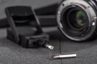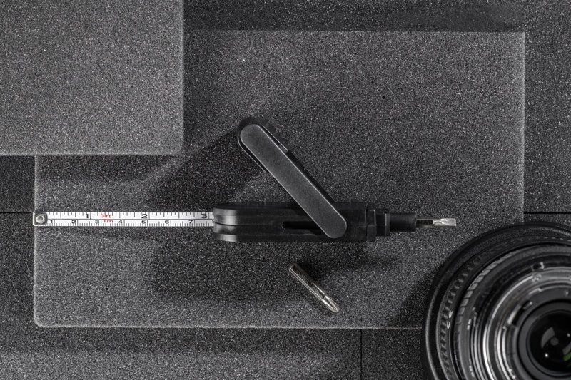 Dwa wymienne bity: płaski i krzyżakowy, miara o długości 1 metra.
