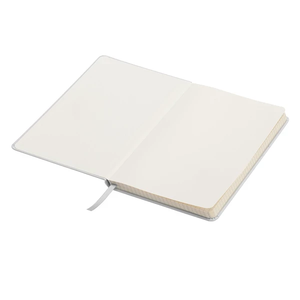 Notatnik w twardej oprawie z elastyczną gumką chroniącą wnętrze. Papier kremowy chamois w kratkę. Tasiemka do zaznaczanie ostatniej zapisanej strony.