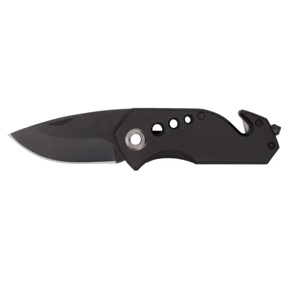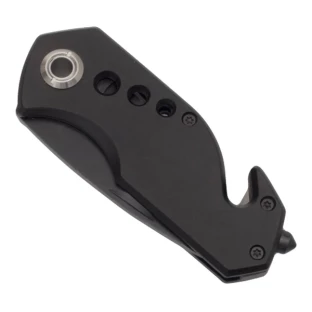 składany nóż z ostrzem o długości 58 mm, blokadą ostrza, młotkiem do rozbicia szyb, przecinakiem do samochodowych pasów bezpieczeństwa i klipem do zaczepienia. Zapakowany w czarnym poliestrowym etui.